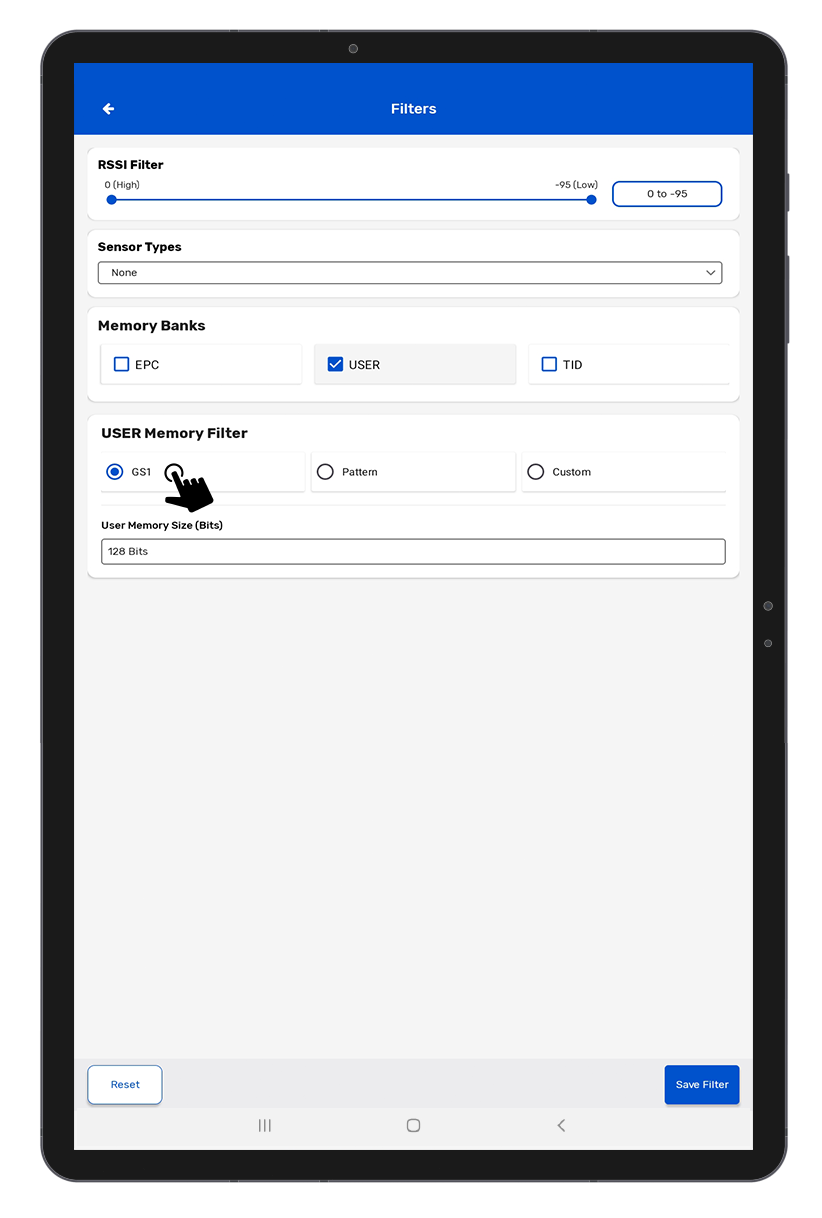 Example: If the Prefix filter is selected and the value AB is entered, only tags that have EPCs that start with AB will be captured.