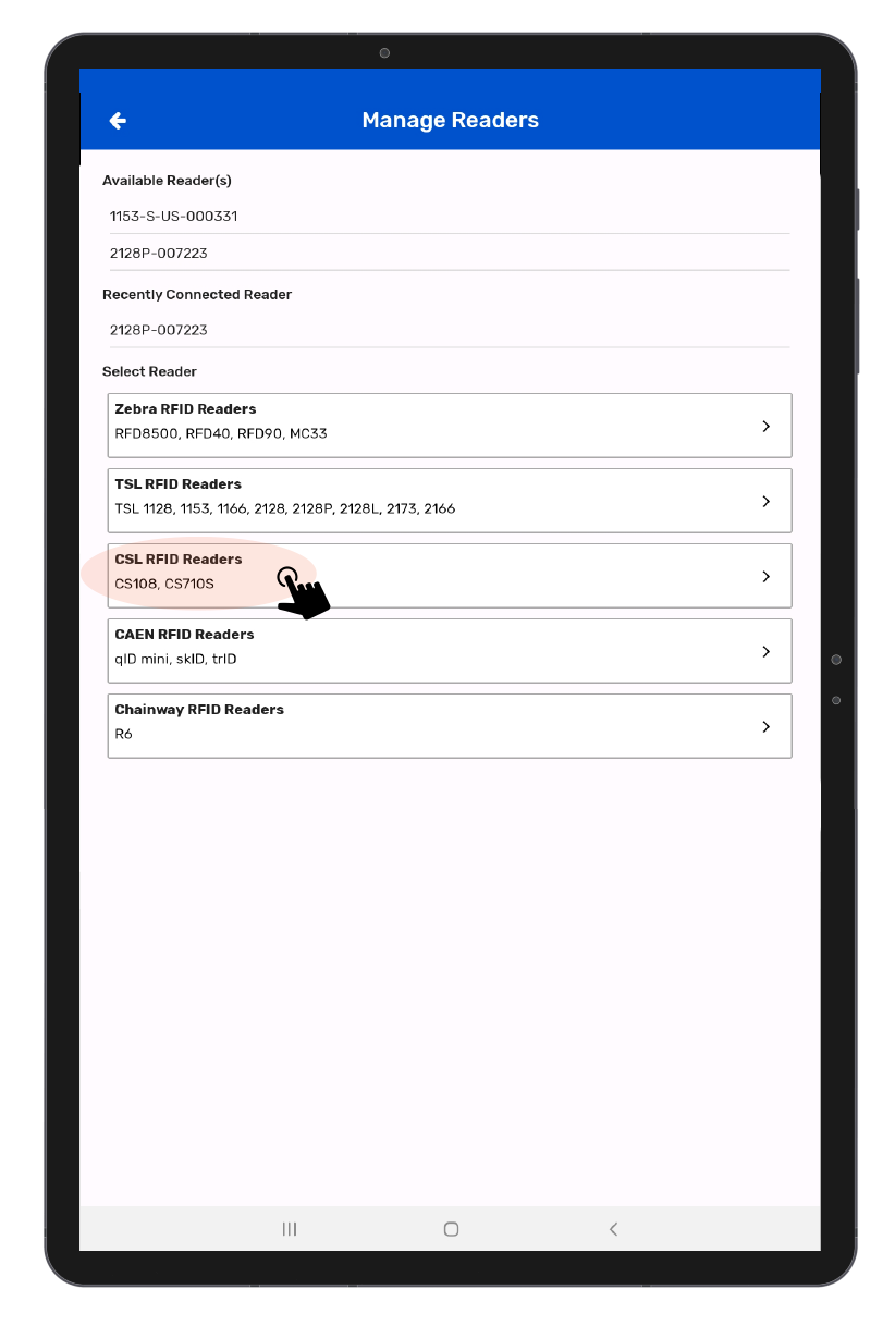 7. Click on CSL 108 and Bring CS108 reader close to Android device.