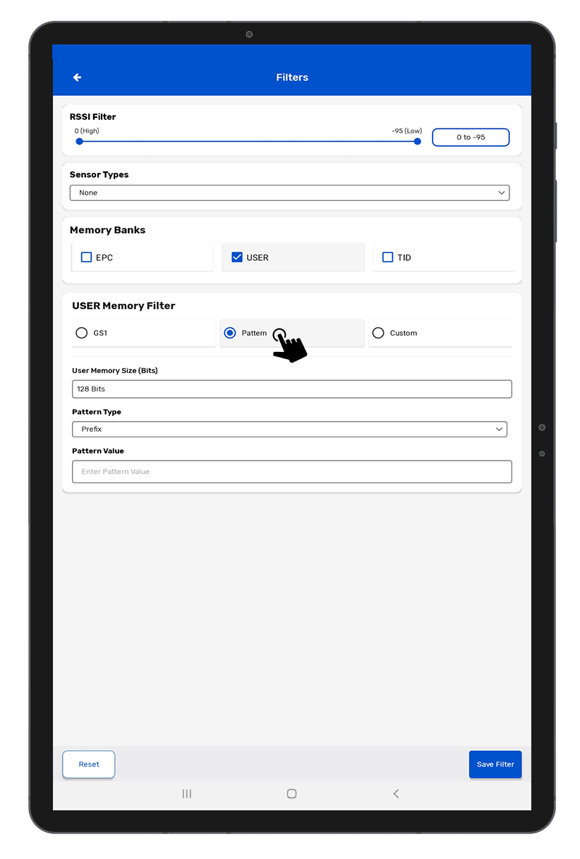 Example: If the Prefix filter is selected and the value AB is entered, only tags that have EPCs that start with AB will be captured.