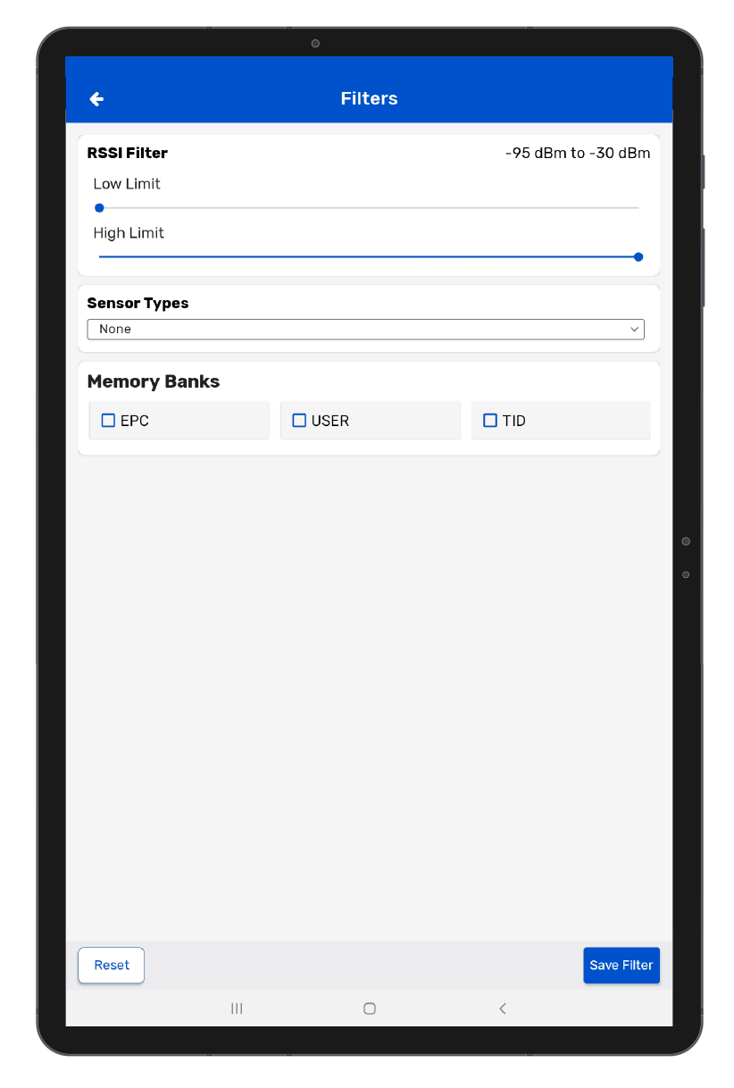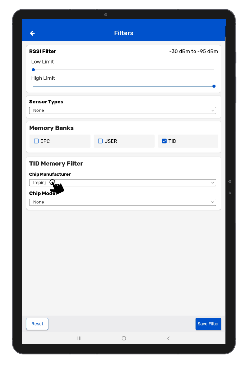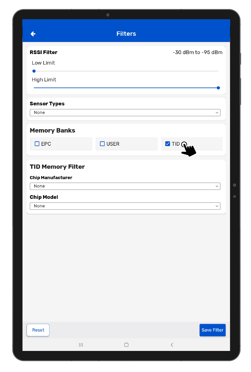 The TID memory bank is a memory bank that is factory encoded and locked. However, this memory bank holds important information about the RFID chip. If you enable this filter, you can read the manufacturer and chip model of the RFID tag.