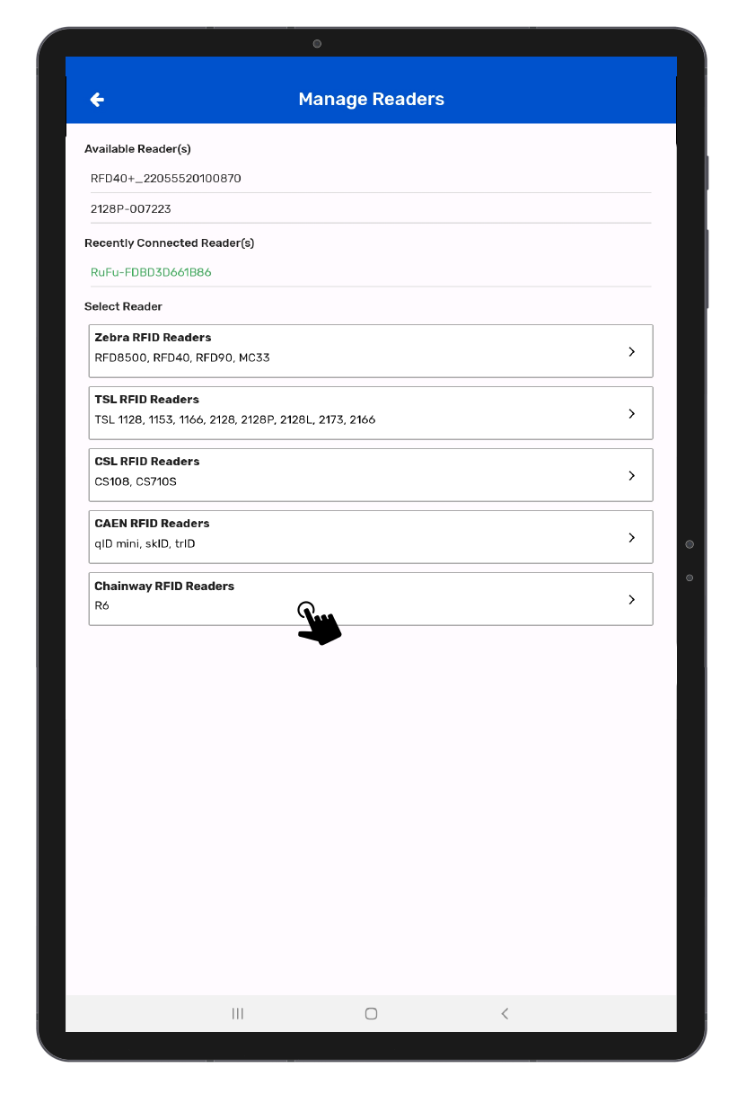 4. To make the connection with the Chainway R6 reader; Click on the “Manage Reader” button - on the Homepage of the application. As shown in Fig 0.2.