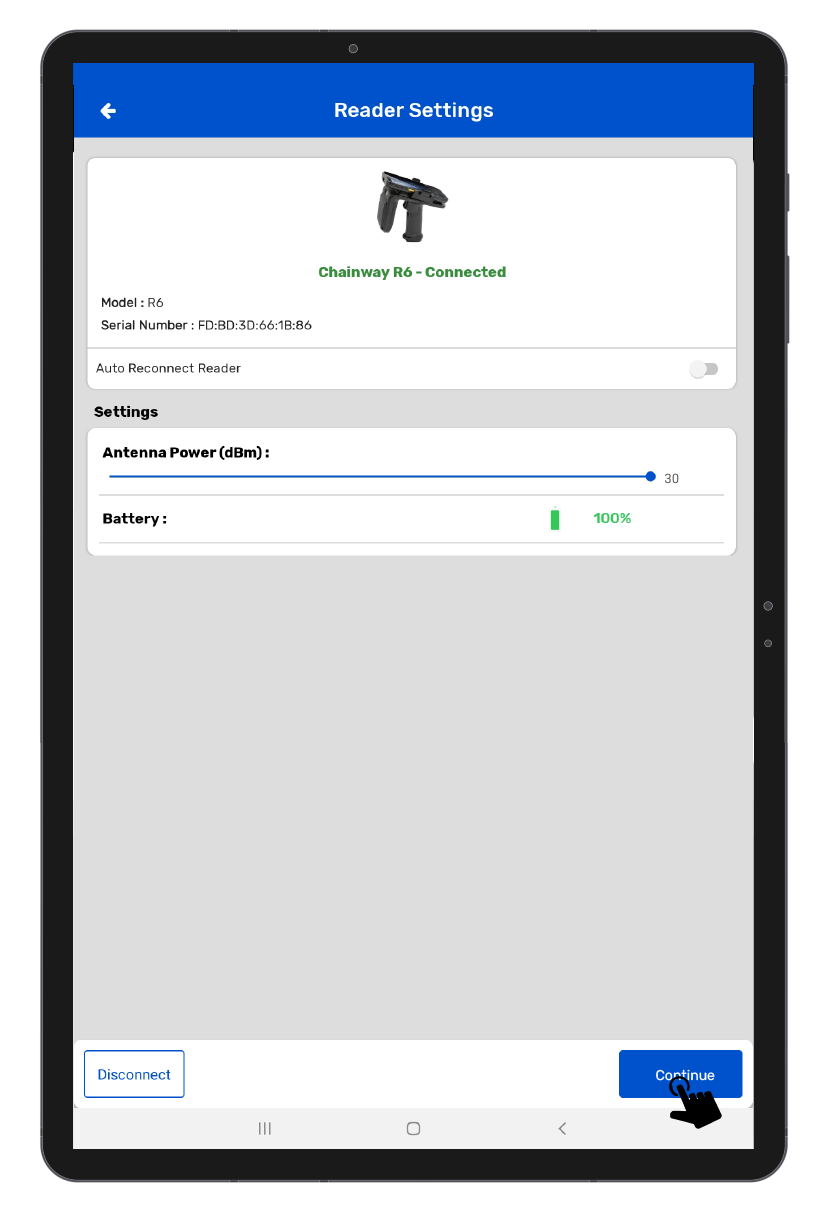 3. As no RFID reader is paired with the Android device, thus the status is showing as: “Reader Disconnected”.
