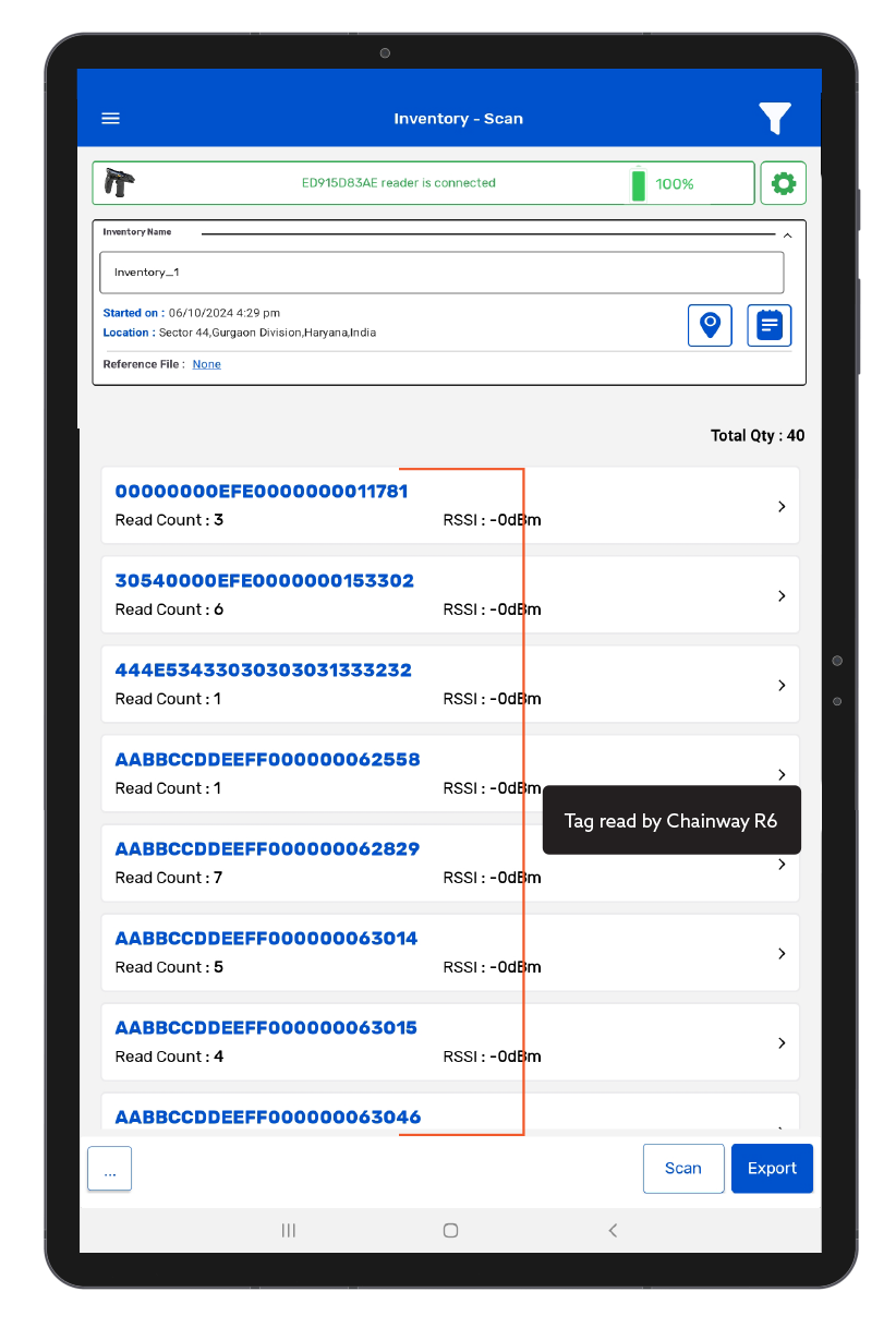 6. This means the Chainway R6 reader is in polling state and reading the tags. Same can be seen in the application window. Refer below image Fig 1.0.