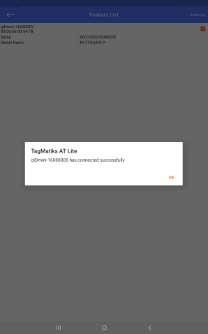 5. Tap on the “qIDmini-16080005” to successfully make the connection between the TagMatiks Wedge application & Caen qID Mini Reader.