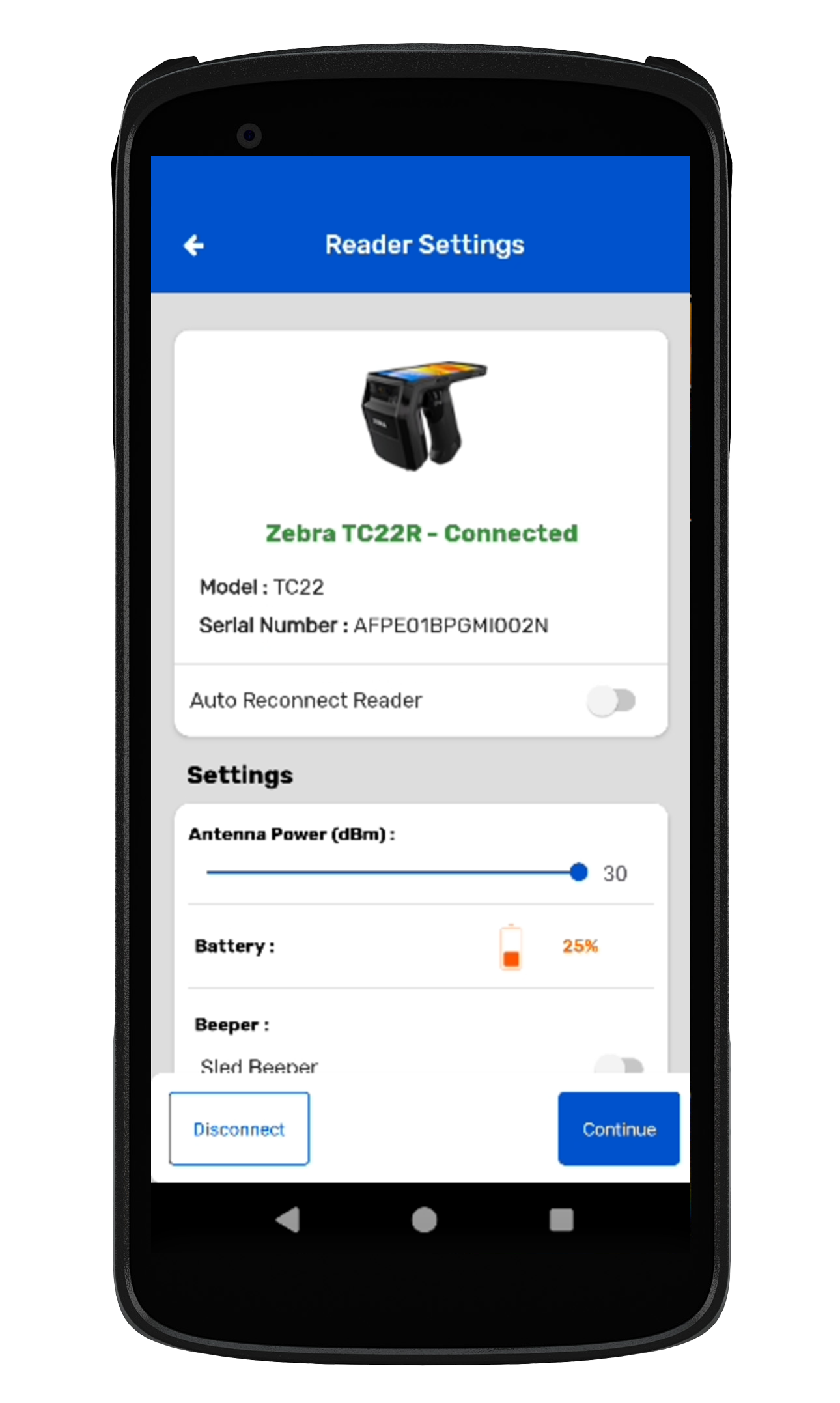 6. After clicking on "Reader," it will connect and redirect to the Reader Settings Page. The application will also fetch the model and serial number of the connected Zebra TC22R device, as shown in Fig 0.4.